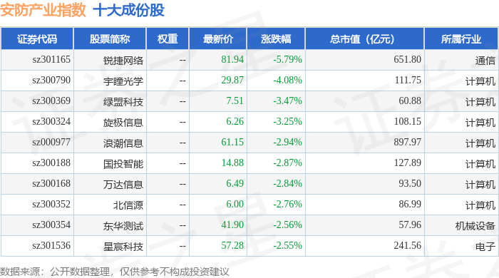 证券之星消息,12月11日,安防产业(399693)指数报收于4952.08点,跌1.29%,成交368.52亿元,换手率3.93%。当日该指数成份股中,上涨的有7家,银河电子以10.08%的涨幅领涨,下跌的有43家,锐捷网络以5.79%的跌幅领跌。