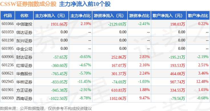 资金流向方面,CSSW证券(399707)指数成份股当日主力资金净流出合计24.61亿元,游资资金净流入合计8.39亿元,散户资金净流入合计16.23亿元。成份股资金流向详情见下表: