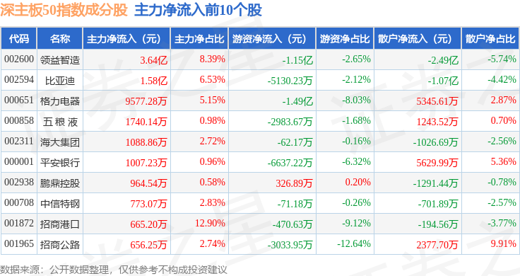 资金流向方面,深主板50(399750)指数成份股当日主力资金净流出合计76.72亿元,游资资金净流入合计17.3亿元,散户资金净流入合计59.42亿元。成份股资金流向详情见下表: