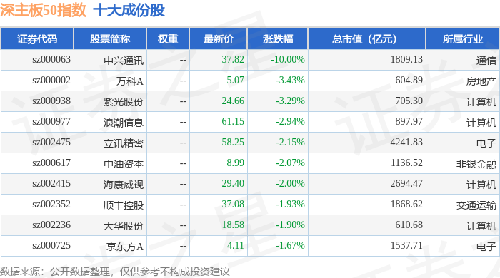 证券之星消息,12月11日,深主板50(399750)指数报收于8821.06点,跌1.24%,成交708.55亿元,换手率1.1%。当日该指数成份股中,上涨的有10家,海大集团以1.41%的涨幅领涨,下跌的有39家,中兴通讯以10.0%的跌幅领跌。