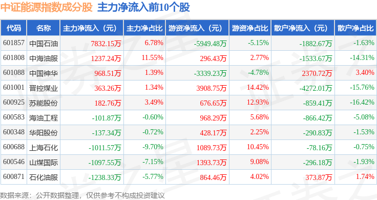 资金流向方面,中证能源(399928)指数成份股当日主力资金净流出合计4.07亿元,游资资金净流入合计1.69亿元,散户资金净流入合计2.37亿元。成份股资金流向详情见下表: