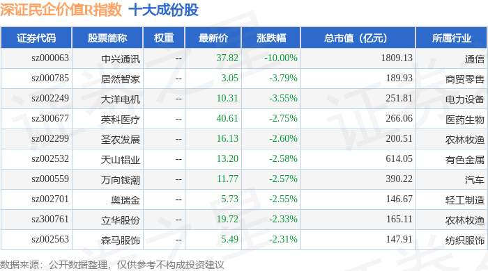 证券之星消息,12月11日,深证民企价值R(470072)指数报收于4591.88点,跌1.31%,成交489.05亿元,换手率2.09%。当日该指数成份股中,上涨的有8家,正邦科技以9.87%的涨幅领涨,下跌的有41家,中兴通讯以10.0%的跌幅领跌。