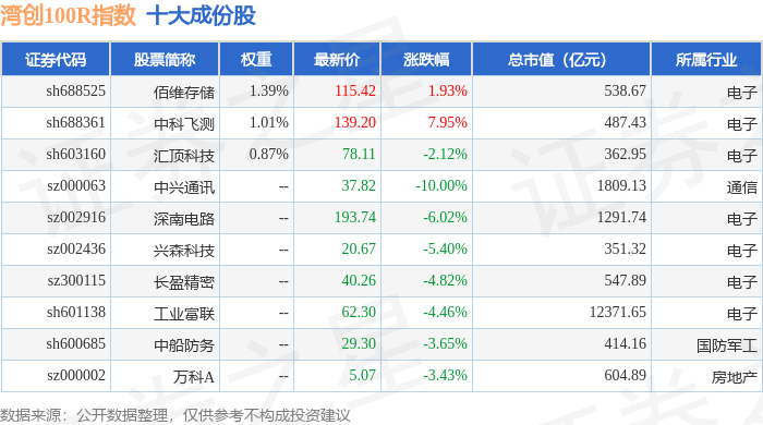 湾创100R(480001)指数十大成份股详情如下: