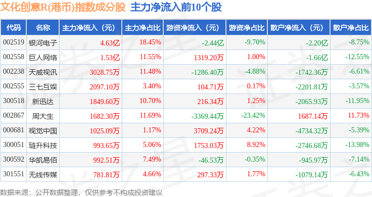 资金流向方面,文化创意R(港币)(480047)指数成份股当日主力资金净流出合计27.2亿元,游资资金净流入合计3.49亿元,散户资金净流入合计23.72亿元。成份股资金流向详情见下表: