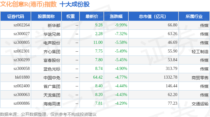 文化创意R(港币)(480047)指数十大成份股详情如下: