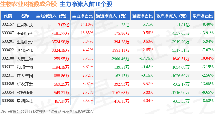 资金流向方面,生物农业R(480072)指数成份股当日主力资金净流出合计14.46亿元,游资资金净流入合计4.44亿元,散户资金净流入合计9.97亿元。成份股资金流向详情见下表: