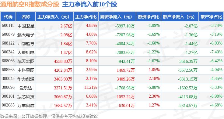资金流向方面,通用航空R(480076)指数成份股当日主力资金净流入合计7647.22万元,游资资金净流出合计9429.67万元,散户资金净流入合计1782.45万元。成份股资金流向详情见下表: