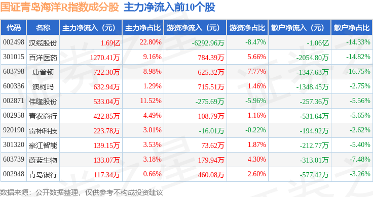资金流向方面,国证青岛海洋R(480532)指数成份股当日主力资金净流出合计1286.55万元,游资资金净流入合计6372.04万元,散户资金净流出合计4904.27万元。成份股资金流向详情见下表: