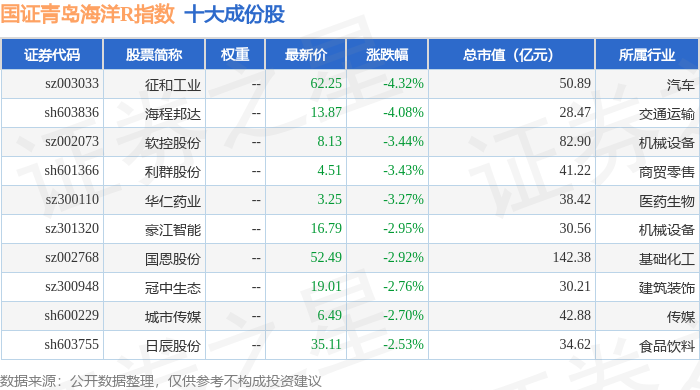 国证青岛海洋R(480532)指数十大成份股详情如下: