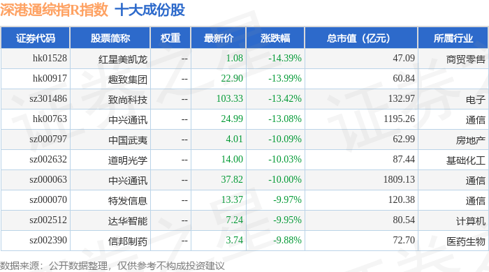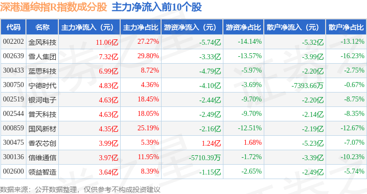 资金流向方面,深港通综指R(483005)指数成份股当日主力资金净流出合计452.7亿元,游资资金净流入合计95.32亿元,散户资金净流入合计357.38亿元。成份股资金流向详情见下表: