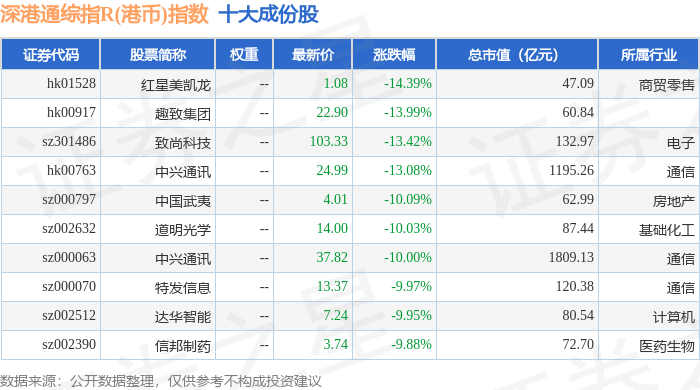 深港通综指R(港币)(483006)指数十大成份股详情如下: