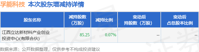证券之星消息,12月11日孚能科技发布公告《孚能科技:孚能科技股东减持股份结果公告》,其股东江西立达新材料产业创业投资中心(有限合伙)于2025年9月11日至2025年12月10日间合计减持85.25万股,占公司目前总股本的0.0698%,变动期间该股股价下跌18.73%,截止12月10日收盘报16.4元。