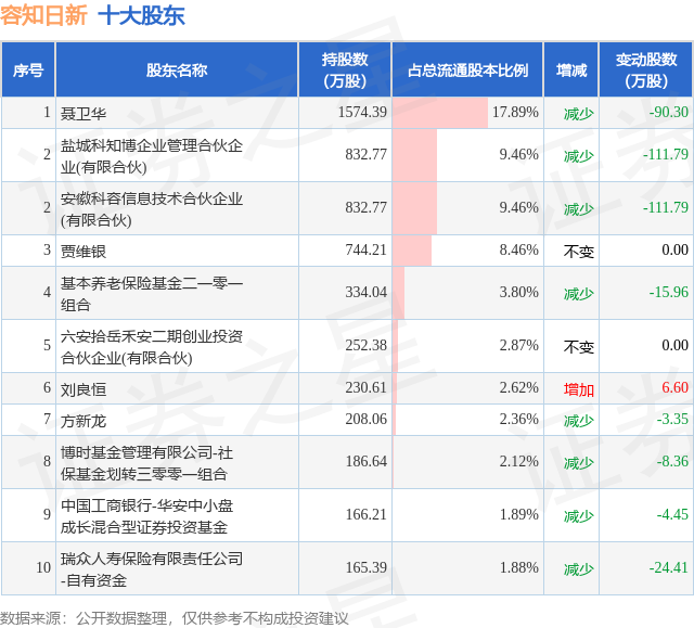 证券之星消息,12月11日容知日新发布公告《容知日新:容知日新股东减持股份结果公告》,其股东盐城科知博企业管理合伙企业(有限合伙)于2025年9月30日至2025年12月10日间合计减持35.09万股,占公司目前总股本的0.3989%,变动期间该股股价下跌14.78%,截止12月10日收盘报40.89元。