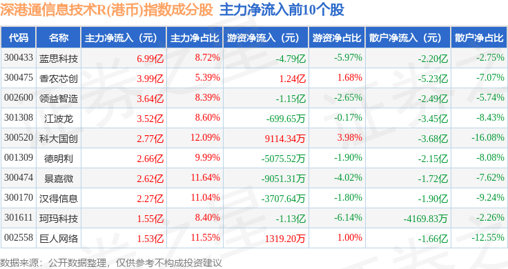 资金流向方面,深港通信息技术R(港币)(483028)指数成份股当日主力资金净流出合计121.28亿元,游资资金净流入合计22.21亿元,散户资金净流入合计99.06亿元。成份股资金流向详情见下表: