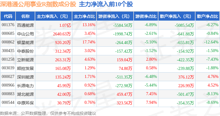 资金流向方面,深港通公用事业R(483031)指数成份股当日主力资金净流出合计2.34亿元,游资资金净流入合计511.48万元,散户资金净流入合计2.29亿元。成份股资金流向详情见下表: