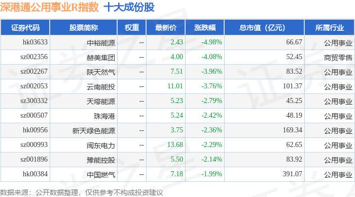 深港通公用事业R(483031)指数十大成份股详情如下: