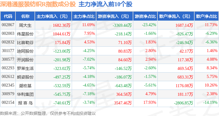 资金流向方面,深港通服装纺织R(483041)指数成份股当日主力资金净流出合计3.04亿元,游资资金净流入合计5582.57万元,散户资金净流入合计2.48亿元。成份股资金流向详情见下表: