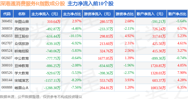 资金流向方面,深港通消费服务R(483045)指数成份股当日主力资金净流出合计4.2亿元,游资资金净流出合计239.31万元,散户资金净流入合计4.22亿元。成份股资金流向详情见下表: