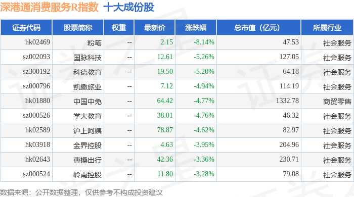 深港通消费服务R(483045)指数十大成份股详情如下: