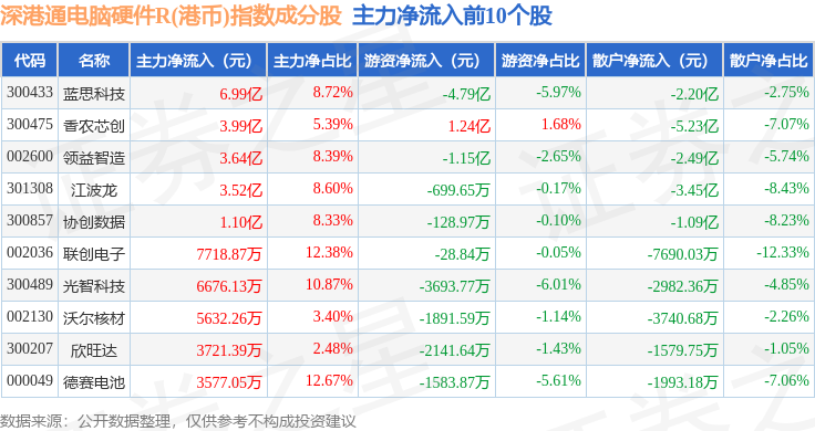 资金流向方面,深港通电脑硬件R(港币)(483044)指数成份股当日主力资金净流出合计71.89亿元,游资资金净流入合计11.34亿元,散户资金净流入合计60.55亿元。成份股资金流向详情见下表:
