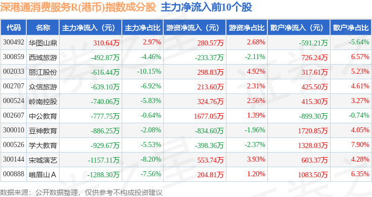 资金流向方面,深港通消费服务R(港币)(483046)指数成份股当日主力资金净流出合计4.2亿元,游资资金净流出合计239.31万元,散户资金净流入合计4.22亿元。成份股资金流向详情见下表: