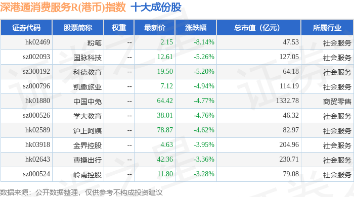 深港通消费服务R(港币)(483046)指数十大成份股详情如下: