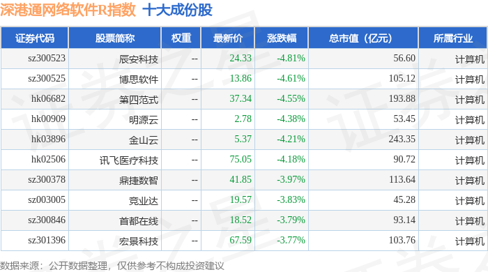 深港通网络软件R(483047)指数十大成份股详情如下: