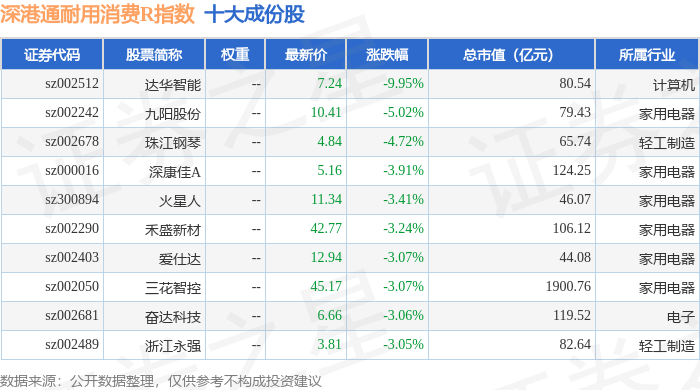 深港通耐用消费R(483049)指数十大成份股详情如下:
