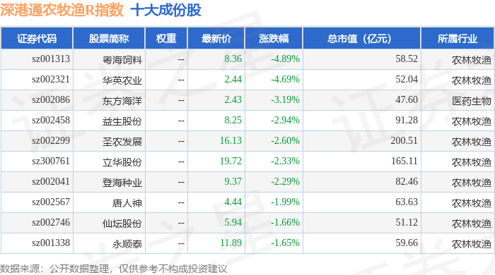 深港通农牧渔R(483051)指数十大成份股详情如下: