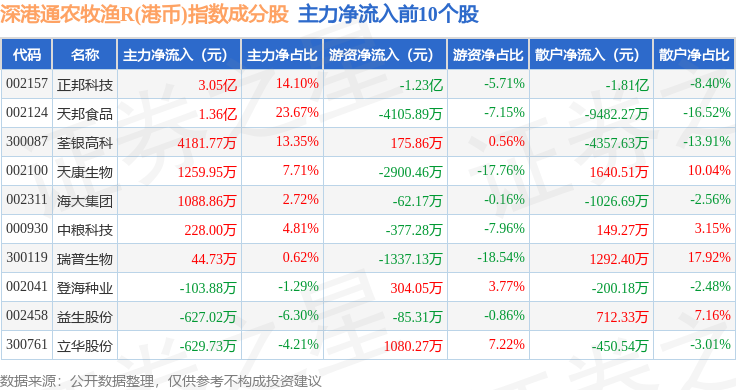 资金流向方面,深港通农牧渔R(港币)(483052)指数成份股当日主力资金净流出合计1.87亿元,游资资金净流入合计6943.38万元,散户资金净流入合计1.18亿元。成份股资金流向详情见下表: