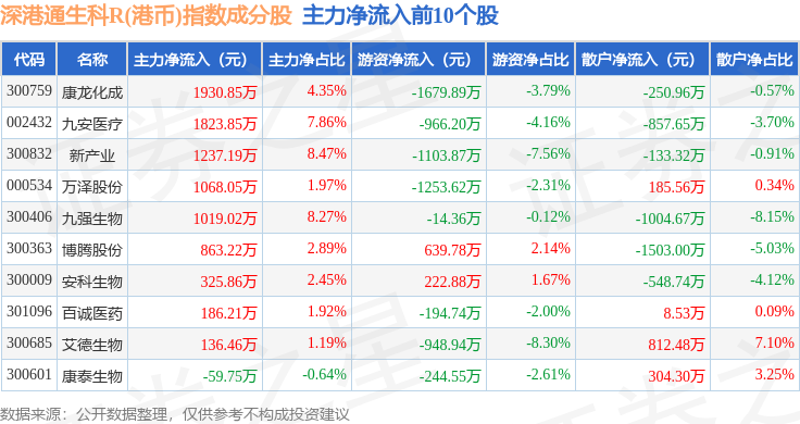 资金流向方面,深港通生科R(港币)(483060)指数成份股当日主力资金净流出合计2.6亿元,游资资金净流出合计1015.4万元,散户资金净流入合计2.7亿元。成份股资金流向详情见下表: