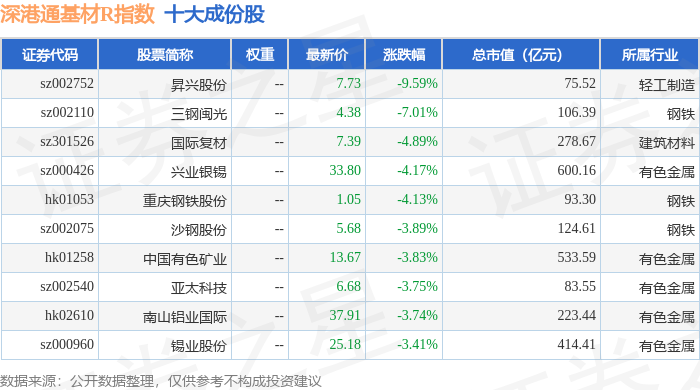 证券之星消息,12月11日,深港通基材R(483061)指数报收于8634.38点,跌0.99%,成交774.58亿元,换手率1.6%。当日该指数成份股中,上涨的有27家,山金国际以6.06%的涨幅领涨,下跌的有111家,昇兴股份以9.59%的跌幅领跌。