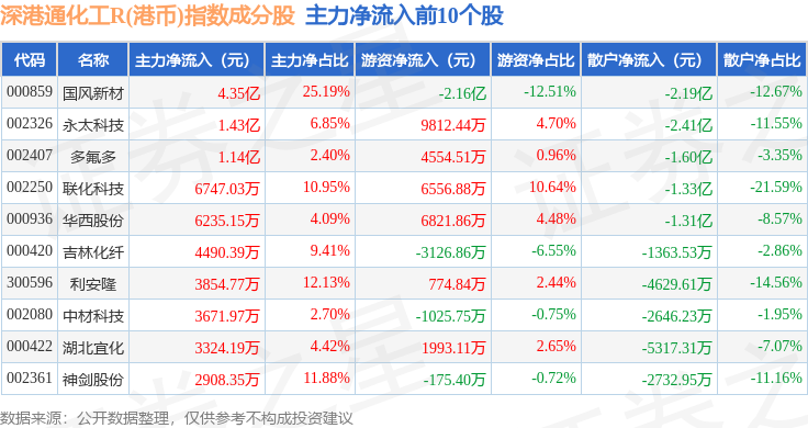 资金流向方面,深港通化工R(港币)(483064)指数成份股当日主力资金净流出合计5.95亿元,游资资金净流入合计3.6亿元,散户资金净流入合计2.35亿元。成份股资金流向详情见下表: