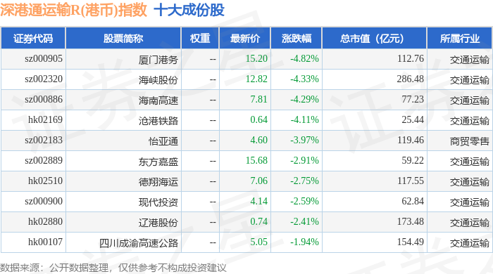 深港通运输R(港币)(483078)指数十大成份股详情如下: