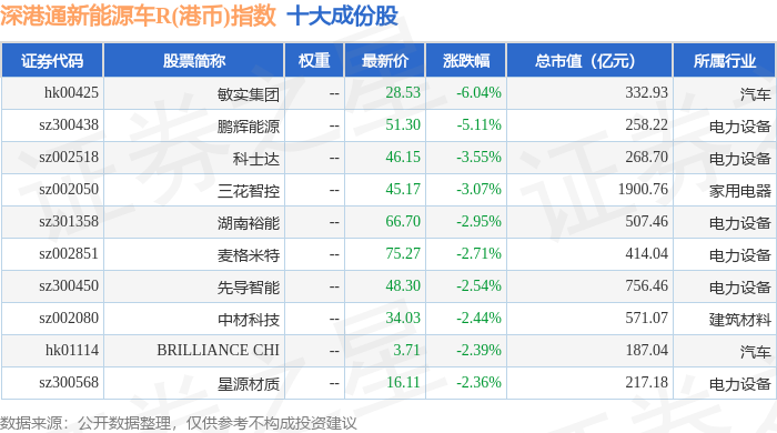 深港通新能源车R(港币)(483088)指数十大成份股详情如下: