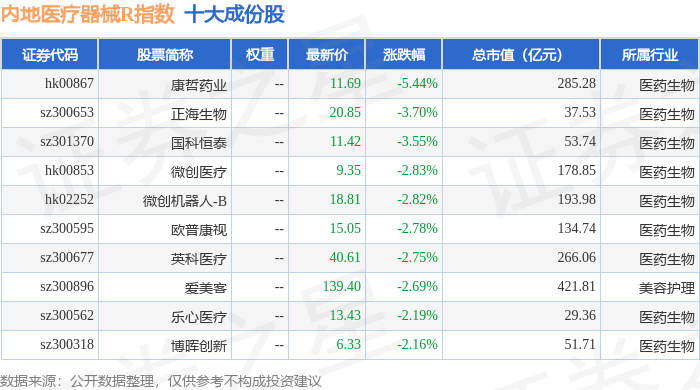 内地医疗器械R(483103)指数十大成份股详情如下: