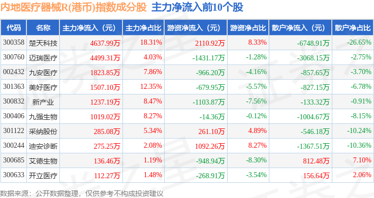 资金流向方面,内地医疗器械R(港币)(483104)指数成份股当日主力资金净流出合计1.92亿元,游资资金净流入合计1891.31万元,散户资金净流入合计1.73亿元。成份股资金流向详情见下表: