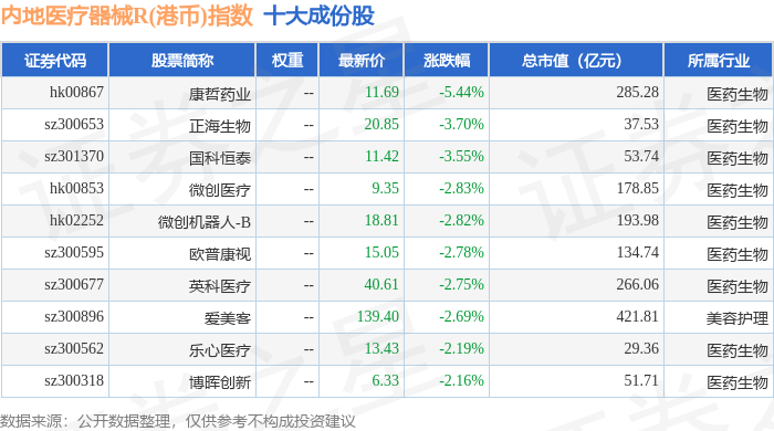 内地医疗器械R(港币)(483104)指数十大成份股详情如下: