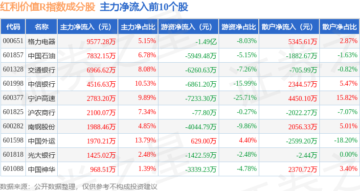 资金流向方面,红利价值R(489016)指数成份股当日主力资金净流出合计9.43亿元,游资资金净流出合计2.85亿元,散户资金净流入合计12.28亿元。成份股资金流向详情见下表: