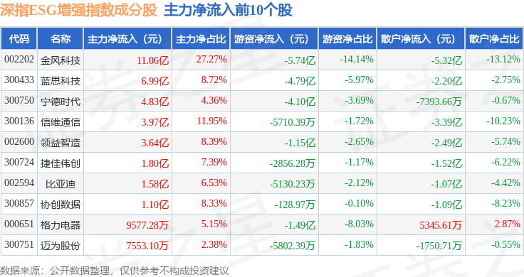 资金流向方面,深指ESG增强(970032)指数成份股当日主力资金净流出合计192.09亿元,游资资金净流入合计60.32亿元,散户资金净流入合计131.77亿元。成份股资金流向详情见下表: