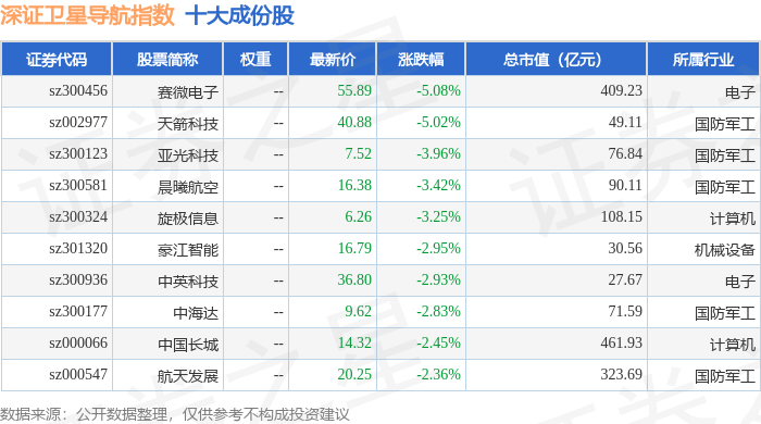 证券之星消息,12月11日,深证卫星导航(970050)指数报收于3541.78点,跌0.85%,成交473.85亿元,换手率7.12%。当日该指数成份股中,上涨的有10家,天迈科技以12.09%的涨幅领涨,下跌的有31家,赛微电子以5.08%的跌幅领跌。