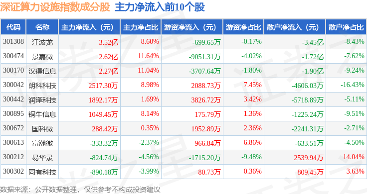 资金流向方面,深证算力设施(970051)指数成份股当日主力资金净流出合计138.09亿元,游资资金净流入合计53.11亿元,散户资金净流入合计84.99亿元。成份股资金流向详情见下表:
