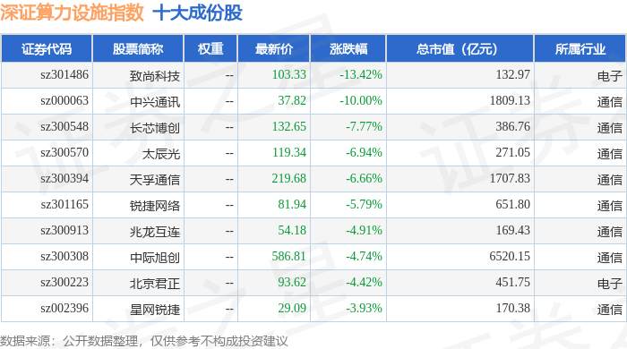 证券之星消息,12月11日,深证算力设施(970051)指数报收于11609.31点,跌3.26%,成交1348.79亿元,换手率3.37%。当日该指数成份股中,上涨的有3家,景嘉微以3.0%的涨幅领涨,下跌的有47家,致尚科技以13.42%的跌幅领跌。