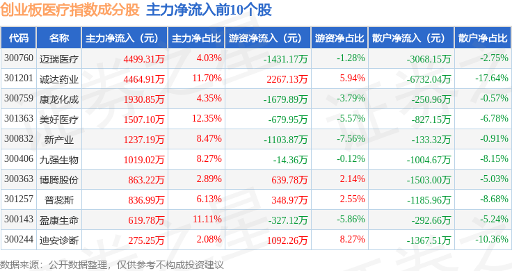 资金流向方面,创业板医疗(970082)指数成份股当日主力资金净流出合计3.07亿元,游资资金净流入合计3457.29万元,散户资金净流入合计2.72亿元。成份股资金流向详情见下表: