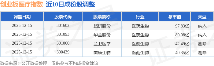 近10日内创业板医疗(970082)指数成份股做了调整,新纳入了2只股票,剔除了2只股票。