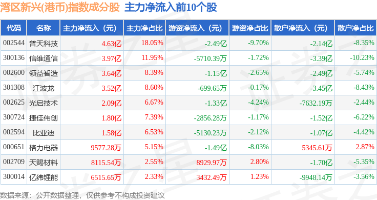 资金流向方面,湾区新兴(港币)(980008)指数成份股当日主力资金净流出合计78.95亿元,游资资金净流入合计15.37亿元,散户资金净流入合计63.59亿元。成份股资金流向详情见下表: