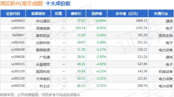 湾区新兴(港币)(980008)指数十大成份股详情如下: