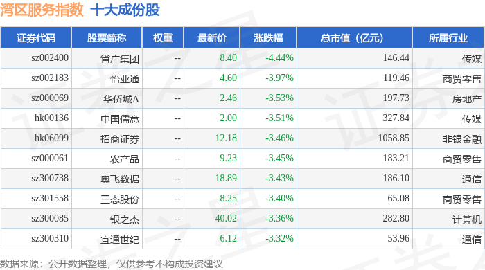 资金流向方面,湾区服务(980011)指数成份股当日主力资金净流出合计9.32亿元,游资资金净流入合计1.13亿元,散户资金净流入合计8.19亿元。成份股资金流向详情见下表: