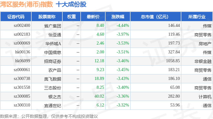 湾区服务(港币)(980012)指数十大成份股详情如下: