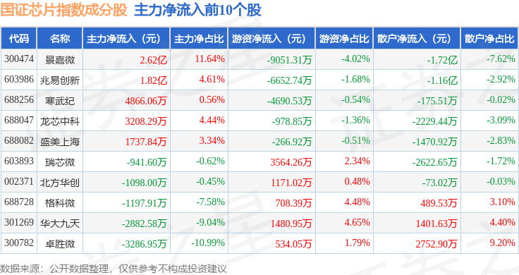 资金流向方面,国证芯片(980017)指数成份股当日主力资金净流出合计25.58亿元,游资资金净流入合计9.28亿元,散户资金净流入合计16.3亿元。成份股资金流向详情见下表: